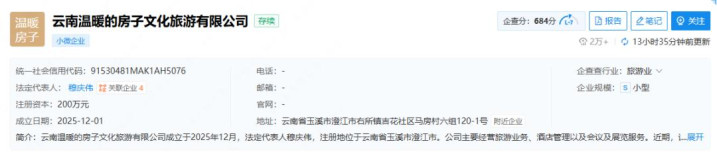 云南省玉溪市澄江市投资促进局对媒体阐发,当地已启动计议地皮平整职责;而承担该项野心主体——云南仁和的屋子文化旅游有限公司,则已于2025年12月在澄江市右所镇马房村先行完成注册。