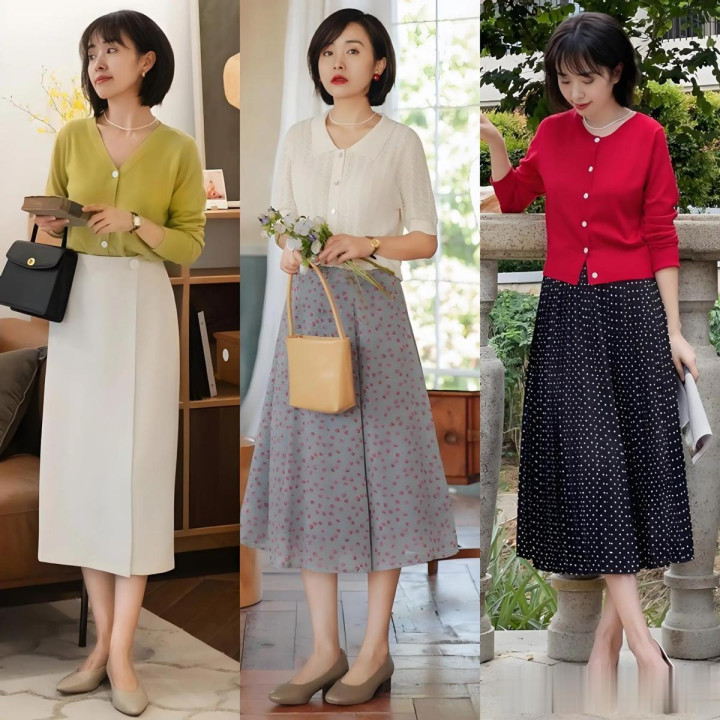 在50岁的年事,寰球天然脸上莫得了十几二十岁满满的胶原卵白,可拔帜树帜的确乎经过岁月千里淀下来而从内开释出的气场和魔力。至于穿衣搭配,其实亦然有不错胜仗套用的“模板”的,那就是“开衫+膝下裙+低跟鞋”组合。