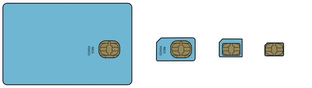 从左至右循序为:全尺寸SIM卡、mini-SIM 卡、micro-SIM卡和nano-SIM卡。|Cvdr based on Justin Ormont's work