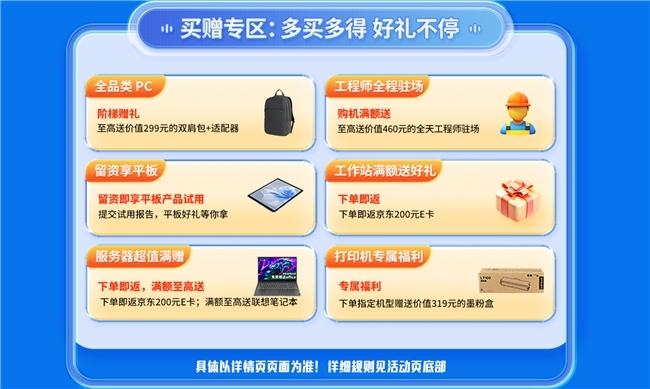 除了PC品类福利,多板块专属权利同步发力,掩盖全场景采购需求。留资福利粗心解锁,提交留资信息即可享受平板产物试用,完成试用呈文还能免费赢取平板好礼,提前体验优质开采,助力政企单元精确选型。干事器专区福利升级,下单即返京东200元E卡,首购更赠价值至高2500元质保干事,满额更有联思音响、智高腕表、平板电脑、条记本电脑等好礼相送,筑牢政企数字化算力根基。