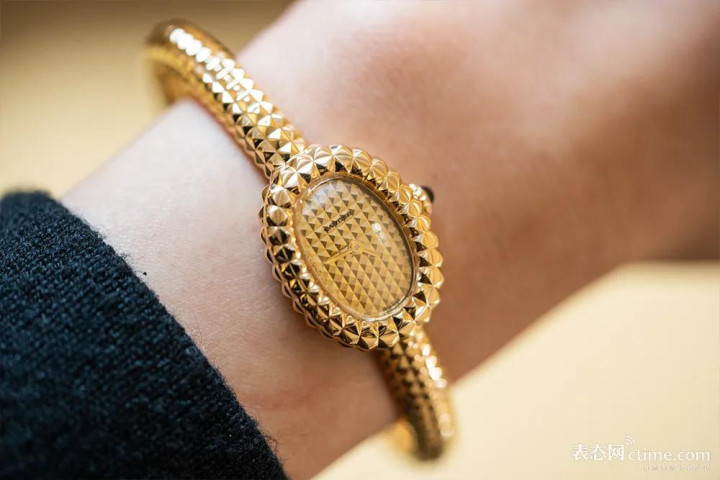 没记错的话,“巴黎饰钉”是卡地亚在20世纪20年代初建立的记号性谋略言语,之前在2019年的Baignoire Allongée手表上也依然初露过矛头。此次卡地亚把巴黎饰钉又作念了一次全面升级,这些讲究的黄金材质的纹饰布满整枚手表,在卡地亚群众级工匠的精密雕刻与抛光下,巴黎饰钉反射出糟践层叠的立体质感与几何光影,个性之余更是好意思妙绝伦。