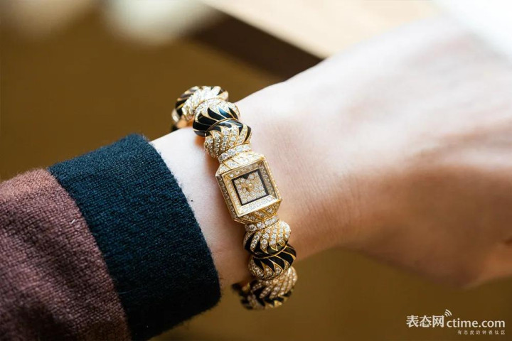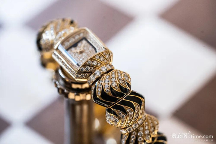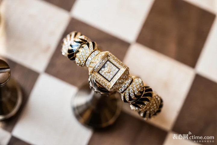 谋略上,表盘四周由淡雅缟玛瑙环绕,并点缀了一枚详细标三角形时标。骁勇的元素在对称布局中彼此呼应,而瓜代的弧线、弧形表镜与铺镶表盘的几何抽象奥密交融,营造出猛烈的视觉对比与张力。工艺层面,表衔领受粒镶工艺,尺寸互异的钻石仅嵌入工序便需耗时高达112小时,才略有你看到的艰深档次感。玄色漆艺条纹动作点缀,是由瑞士Maison des Métiers d’Art工匠以手工逐笔点绘而成,每一笔都凝结着对细节的极致追求。