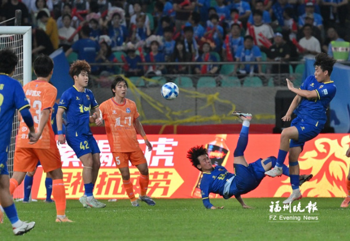 福州队球员倒钩射门。 记者 张旭阳 摄