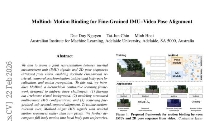 当你戴着智高手环在跑步时,你有莫得念念过,如果能让手环记录的通顺数据与跑步视频无缺同步,会产生何等神奇的效果?来自阿德莱德大学澳大利亚机器学习量度所的科研团队最近就终泄漏这个看似不可能的任务。这项名为"MoBind"的量度发表于2026年2月,论文编号为arXiv:2602.19004v1,它初度终泄漏惯性测量单位(IMU)传感器与视频中东谈主体姿态的精确对都,始创了多模态感知技艺的新纪元。